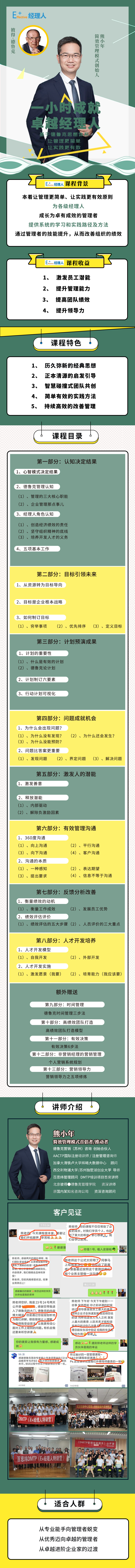 经理人基于德鲁克思想体系,本着让管理更简单、让实践更有效原则,为各级经理人成长为卓有成效的管理者提供系统的学习和实践路径及方法。通过管理者的技能提升,从而改善组织的绩效。
