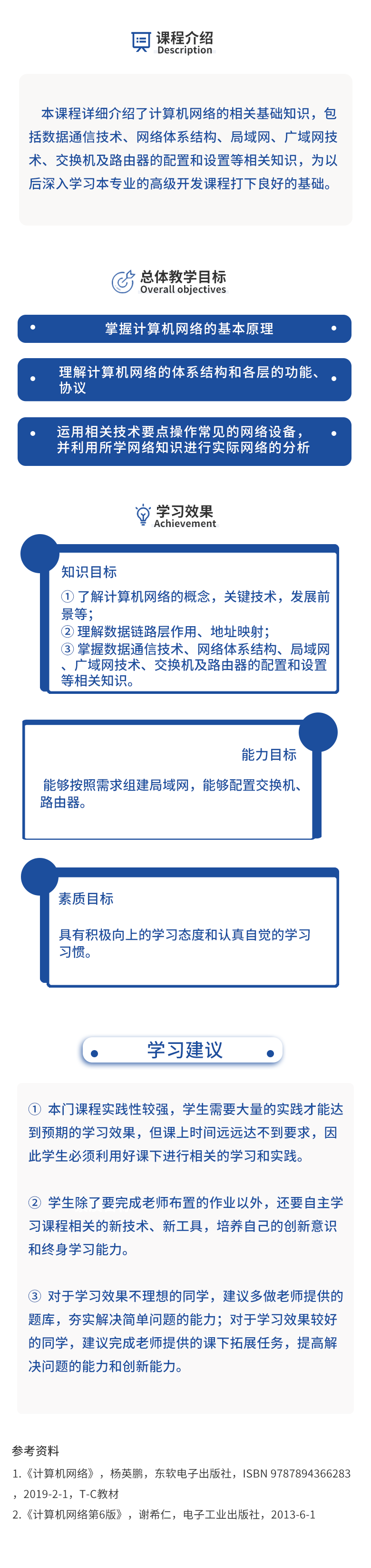 掌握计算机网络的基本原理; 理解计算机网络的体系结构和各层的功能、协议; 运用相关技术要点操作常见的网络设备,进行实际网络的分析。