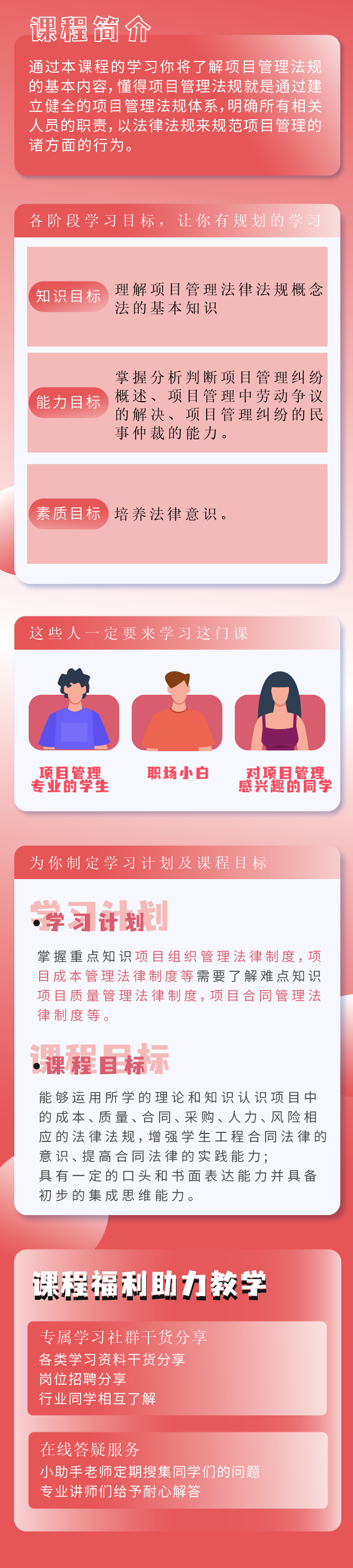 通过本课程的学习将了解项目管理法规的基本内容,懂得项目管理法规就是通过建立健全的项目管理法规体系,明确所有相关人员的职责,以法律法规来规范项目管理的诸方面的行为。