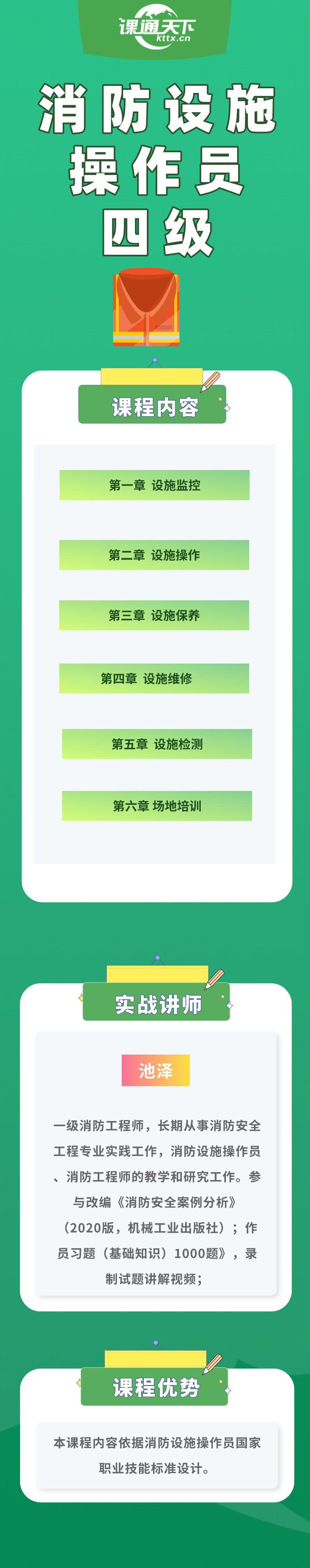 本课程共计38课时,适应于从事消防设施操作的人员学习。主要内容包括:消防设施巡检、设施报警信息处置、火灾自动报警系统操作、自动灭火系统操作、其他消防设施操作、火灾自动报警系统保养、自动灭火系统保养、其他消防设施保养、火灾自动报警系统维修、自动灭火系统维修、其他消防设施维修、火灾自动报警系统检测、自动灭火系统检测、其他消防设施检测等知识点,完全符合国家技能培训大纲要求。